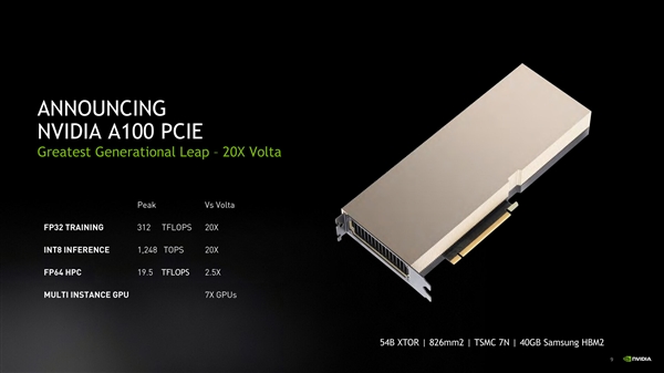 NVIDIA宣称,相比于上代Volta伏特架构的V100计算卡,INT8推理性能、FP32训练性能都实现了20倍的提升,FP64高性能计算也提升了2.5倍,是历史上进步最大的一次。