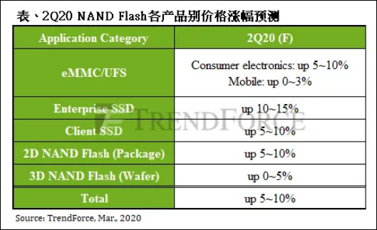 3月底,集邦咨询半导体研究中心(DRAMeXchange)的调查显示,虽然新冠疫情蔓延,使得2020年第一季度的终端产品出货动能格外疲弱,但在闪存(NAND Flash)领域,由于2020年全年供给收缩,加上各大供应商资本支出保守,第一季NAND Flash均价在淡季仍上涨约5%。