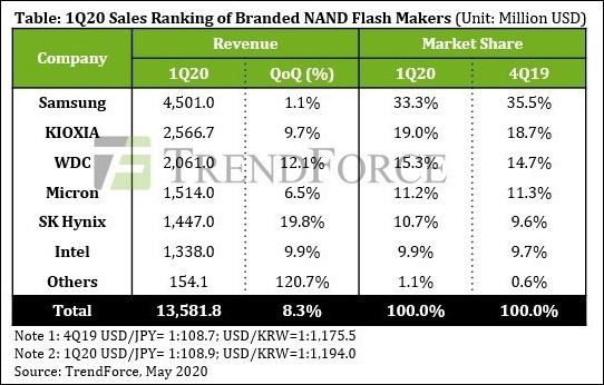 事实上,目前全球闪存市场仍高度集中且被国外厂商垄断。2020年一季度,三星、铠侠(东芝)、西部数据、美光、海力士、英特尔等在全球闪存市场合计占有率超99%。