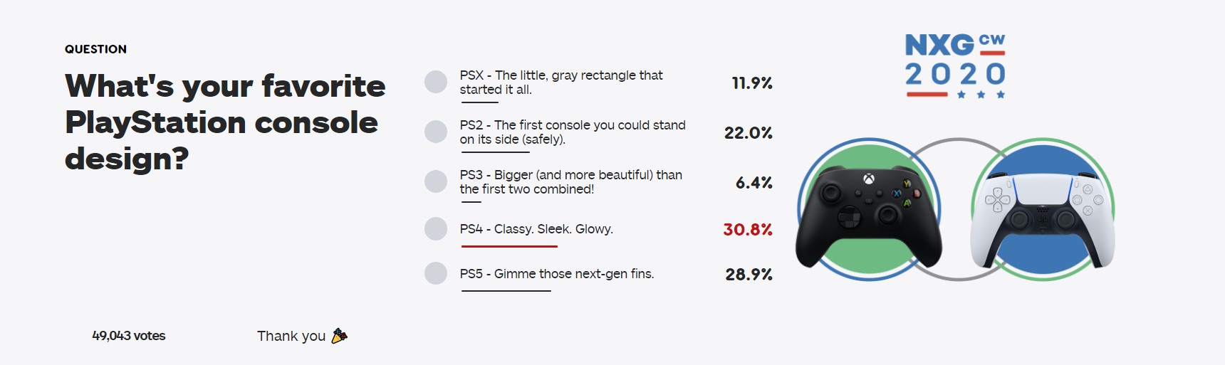 PS5目前已经正式公布了主机的造型,相比以往的PlayStation主机,PS5的造型要大上不少,IGN最近就进行了一项“玩家最喜欢的PlayStation主机造型”投票,有多达4.9万人参与,结果PS4击败了PS5夺得了冠军。