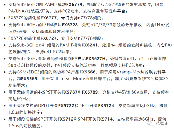 据介绍,此次飞骧科技推出的5G射频前端解决方案是一套完整的射频芯片产品族,包括: