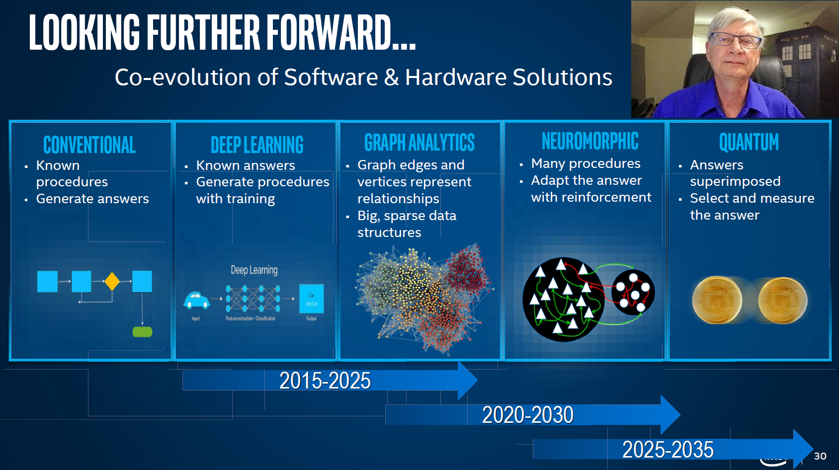 他还展望了更遥远的未来,2030年前有望进入神经拟态(neuromorphic)的计算时代,而至于量子计算,可能要2030-2035年才能真正投入商用。