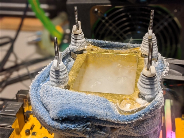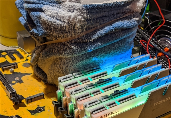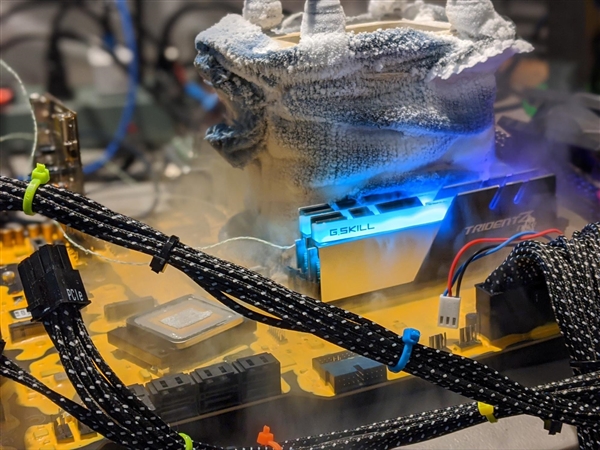 14nm+++++工艺又怎样?Intel十代酷睿已经把5GHz+当成了家常便饭,而在液氮极限环境下,超频也是轻而易举,Tom's Hardware就将一颗旗舰级i9-10900K超到了7GHz之上。本次超频使用了华擎Z490 Aqua Prototype 2 DIMM主板、芝奇NEO 4000C19 16GB×2内存、安耐美Maxtytan 1250W电源等,和自己打造的“液氮大炮”。