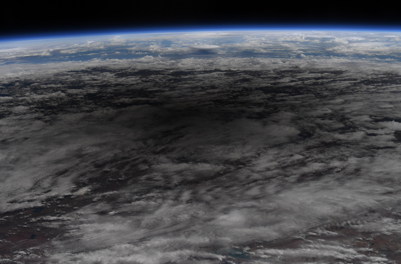 地球上的日食观测者欣赏到的是偏食或日环食。由于月球距离地球太远,无法完全遮住太阳,因此产生了 "火环 "效应。从国际空间站的视角看,日食出现了月球投下的大阴影。