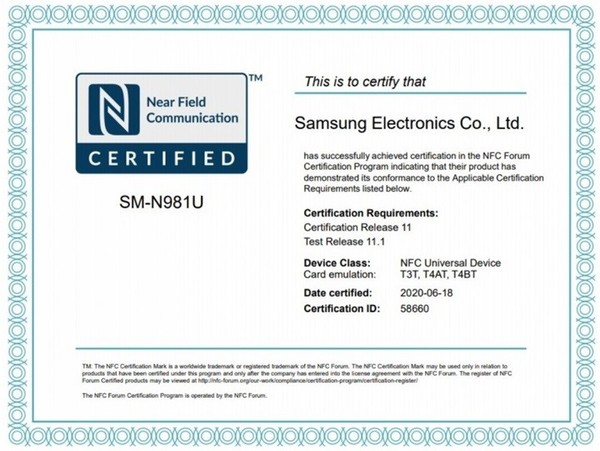 按照往年惯例,三星会继续在今年的下半年推出全新一代Galaxy Note20系列旗舰,甚至有外媒表示该机将于8月5日与大家见面。随着6月进入尾声,距离预计的发布时间越来越近,自然也有越来越多的关键细节得到曝光。现在有最新消息,近日有外媒再度透露,该系列旗舰已经通过了NFC Forum认证。