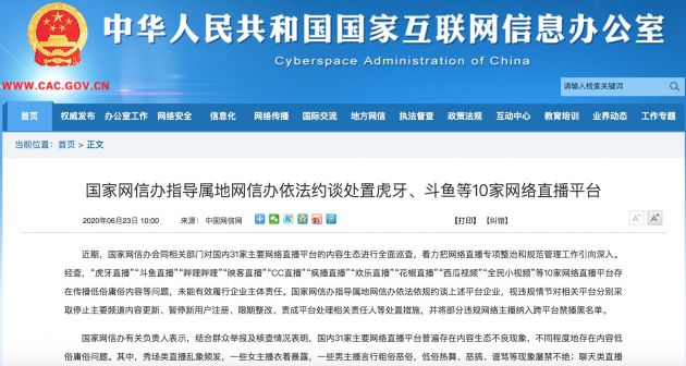 国家网信办指导属地网信办依法约谈处置虎牙、斗鱼等10家网络直播平台