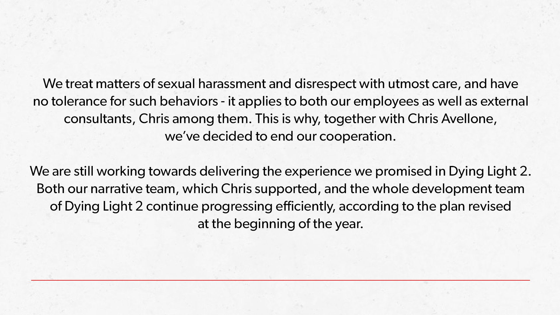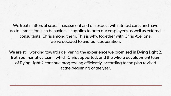 Techland发布的公告称:我们对性骚扰和对他人不尊重的这种事情会非常谨慎地对待,不会容忍这种行为,这项原则适用于我们的所有员工和外部顾问,其中就包括Chris Avellone。所以我们决定与Chris Avellane结束合作。