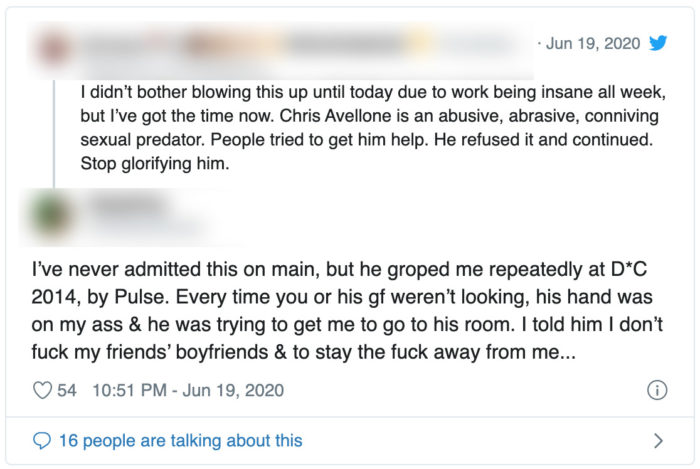 一位独立游戏开发人员也证实了Chris Avellone的性骚扰行为,她指控Chris Avellone在2014年曾对她进行不断的抚摸,被别人发现了之后才停手。
