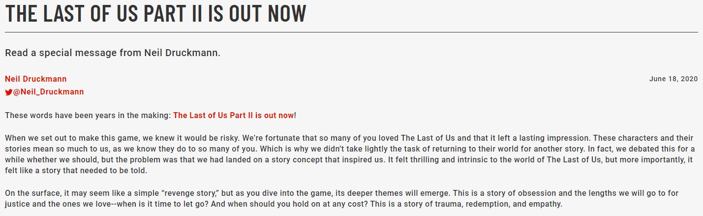 实际上早在游戏还未拥有大量差评之前,Neil Druckmann就发表了相关文章阐述了游戏剧情的所要传达的理念。