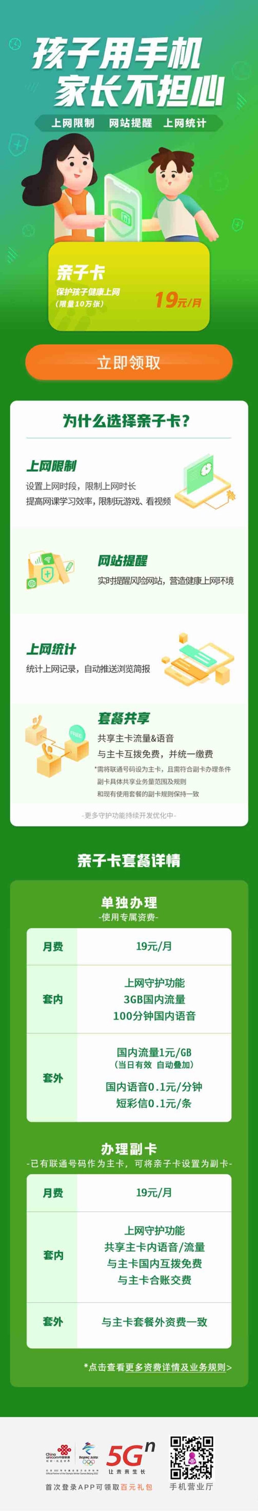 6月23日消息,中国联通“亲子卡”首发,限量10万张,大家可在“手机营业厅”APP搜索“亲子卡”购买。亲子卡支持上网限制、上网统计、网站提醒等功能,可以让父母更好的控制孩子上网。亲子卡支持单独办理,也支持当副卡使用,月费均为19元,都支持上网守护功能。