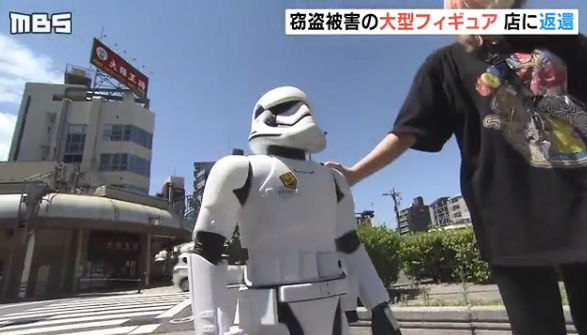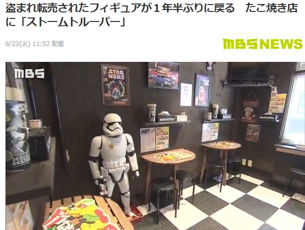 ·据警方透露,2018年11月时,这家位于日本大坂·日本桥的章鱼丸子店发生失窃事件,丢失了一件异常昂贵的大型手办星战风暴士兵,后来根据监控录像警方追查到是一名33岁男子所为,据称已经被其以15000日元超低价格转手,经过几番折腾,这位士兵先生终于回到了老家。