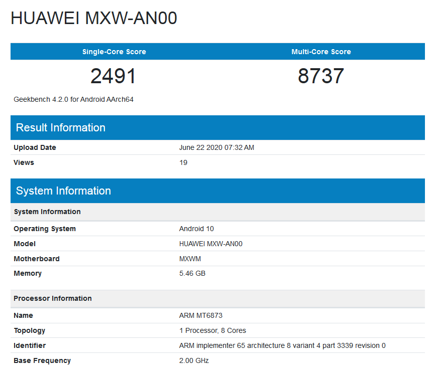 根据国内工信部网站信息,型号为“MXW-AN00”的荣耀新机即将登场。从网站上公布的信息来看,这是一款 5G 手机。此外该机已经现身 GeekBench 4.2 跑分库,单核成绩为 2491 分,多核成绩为 8737 分。
