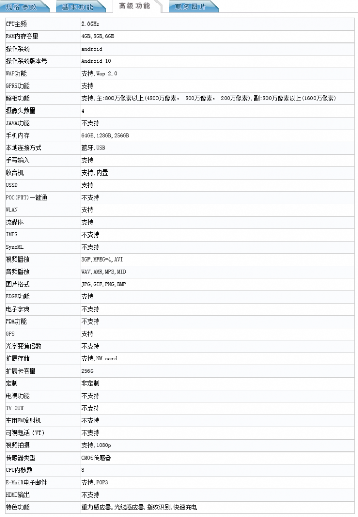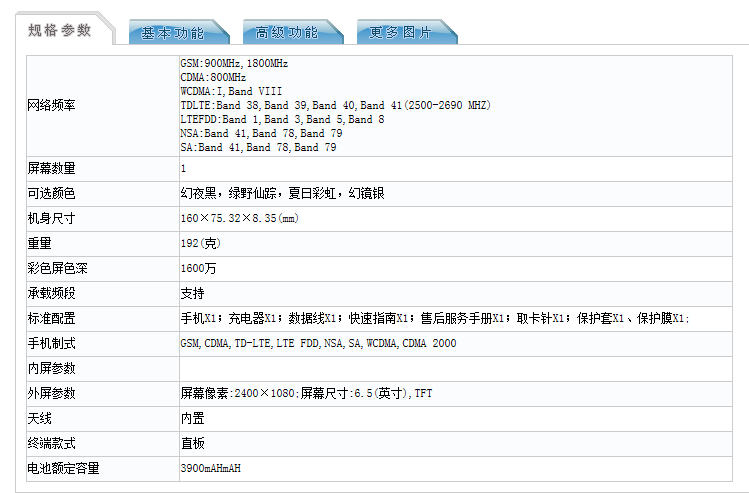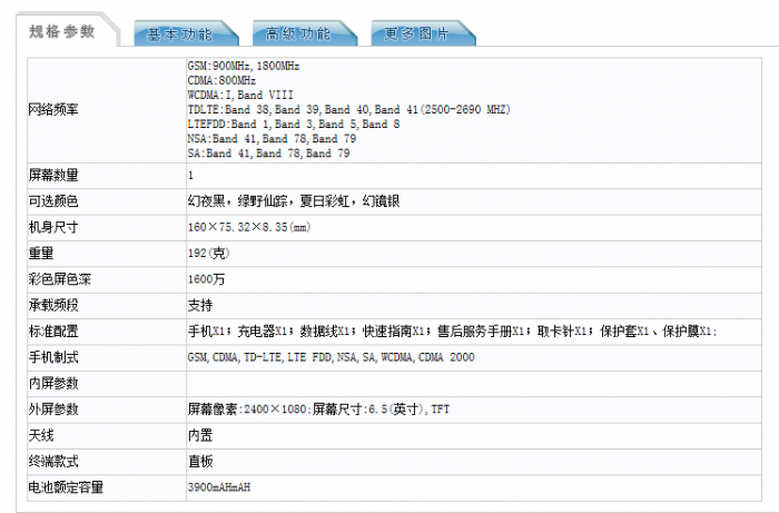 该机采用一块6.5英寸的水滴屏幕,分辨率为2400×1080;内置一块3900mAh容量电池,支持快速充电技术;机身尺寸为160×75.32×8.35mm,重量是192g。