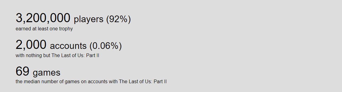 有2000个PSN账号(占0.06%)中只有《最后的生还者2》这一款游戏,拥有《最后的生还者2》的PSN账号中平均游戏数量为69个。
