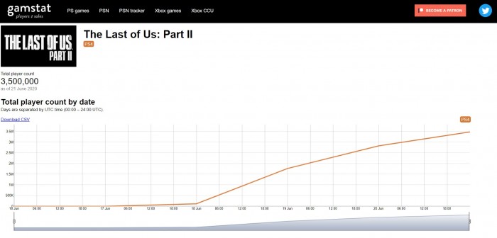 据PSN数据抓取网站gamstat公布的数据显示,截止6月21日,《最后的生还者2》发售3天,PS4玩家人数总计达到350万人,同时统计图显示这期间玩家人数上升的速度非常之快。此外,gamstat数据显示,有320万玩家(占92%)至少获得了一个奖杯。