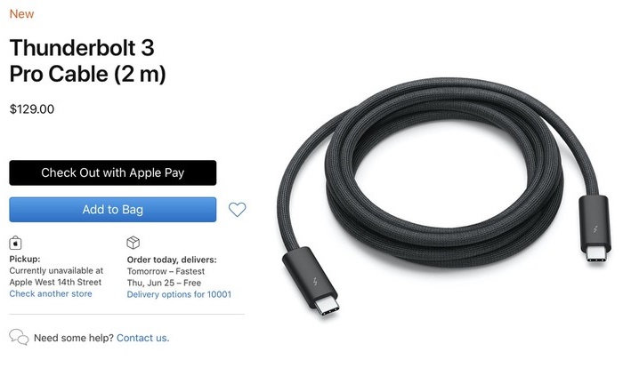 MacRumors 报道称,苹果悄然在官网商店放出单独的雷电 3 Pro 线缆产品。此前,这款配件只能随 Pro Display XDR 专业级显示器一同购买。其采用了编制外皮和有源传输技术,支持最高 40 Gbps 的带宽(完整的雷电 3 速率),2 米版本的售价为 129 美元(约 912 RMB)。