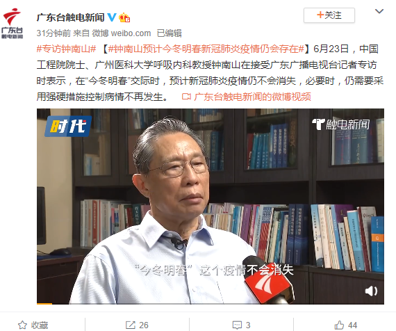 6月23日,中国工程院院士、广州医科大学呼吸内科教授钟南山接受了广东广播电视台记者采访,他表示今冬明春这个疫情不会消失,或者冬天到春天的时候会增加了,都有这个可能。