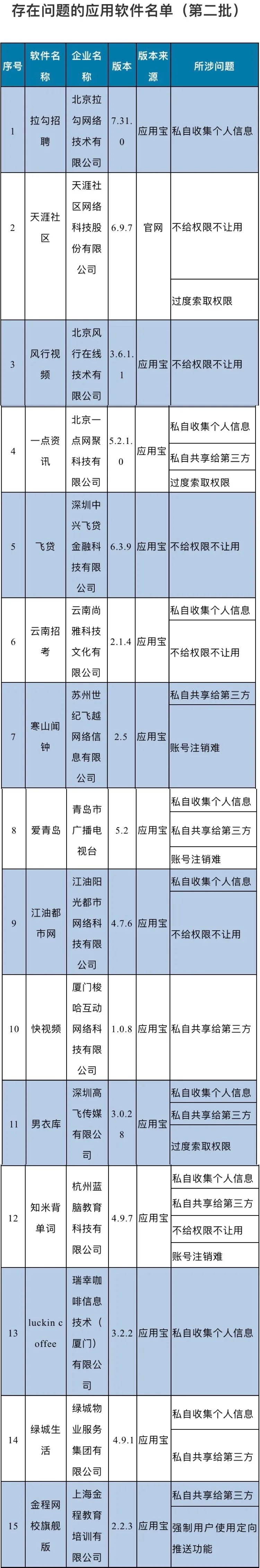 今年1月份,工信部又点名了15款App,包括拉钩招聘、瑞幸咖啡、天涯社区等;5月份,信息通信管理局发布通知,点名16款App,因为他们存在不合理索取用户权限行为,包括当当、e代驾、千千音乐、七猫免费小说、WiFi管家等。