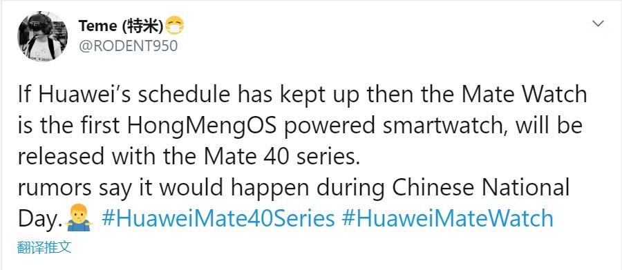 爆料称Mate Watch将与华为Mate 40系列同台亮相,后者是今年华为的年度旗舰产品。按照惯例,Mate 40系列可能包括Mate 40、Mate 40 Pro和Mate 40 RS保时捷设计等。