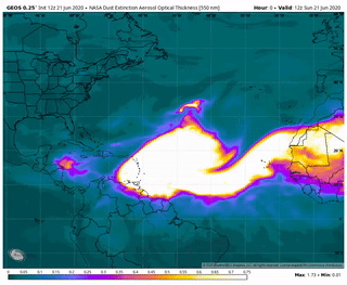 尘埃云会使空气质量急剧下降,达到使市民处于危险之中的程度,尤其是当市民已有呼吸道疾病时,这种尘埃云会对健康造成危害。目前,"哥斯拉尘云 "正横扫加勒比海地区,预计最终将到达美国海岸。