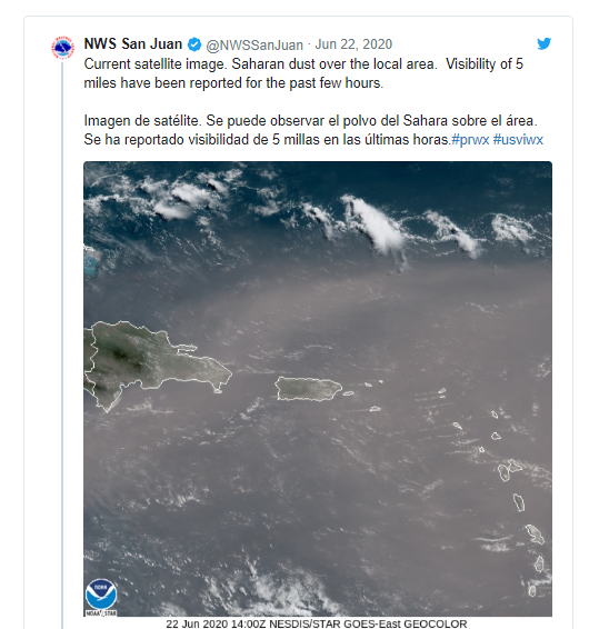 在巴巴多斯,巴巴多斯气象局发表声明,敦促人们把个人健康和安全放在第一位。"严重的撒哈拉沙尘爆发继续影响岛屿和海洋地区,"一份公共警告写道。"居民、游客和海洋用户应做好准备,采取行动,因为重大的尘雾继续降低整个岛屿和海洋区域的能见度。有呼吸系统问题或过敏症的人必须在旅行时携带所有相关的处方药,或在手边准备好所有相关的处方药,以备不时之需。"