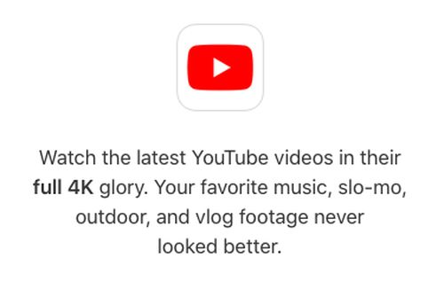 由于缺乏 VP9 的支持,目前 iPhone、iPad 和 Apple TV 在观看 YouTube 视频的时候最高只能到 1080P。在最新的 tvOS 测试版本中,苹果增加了对谷歌编解码器的支持--简单地说,用户可以 “以其完整的 4K”观看 YouTube 片段。
