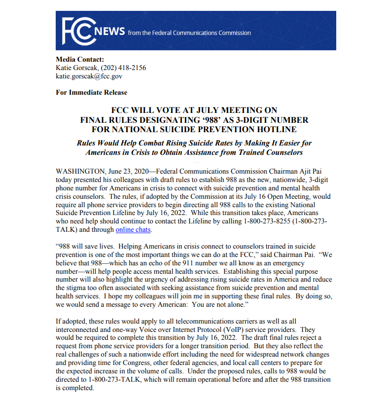 去年提出的规则将要求所有的电话公司将电话传输到988到国家自杀预防生命线,目前通过1-800-273-8255(TALK)达到。如果规则被通过,电话供应商将在2020年7月16日之前进行转换。