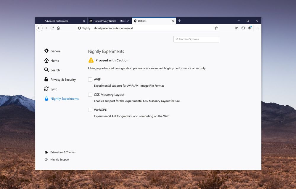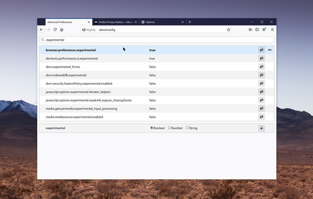 打开浏览器之后,在地址栏上输入“about:config”进入 Flag 配置页面。然后在顶部的搜索栏中,输入“browser.preferences.experimental”,找到这个 Flag 之后,并将其设置为启用状态。