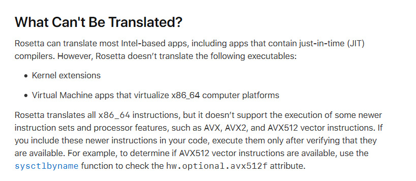 在本周发布的苹果官方开发者文档中,介绍了 Rosetta 2 应用的技术限制。其中值得注意的是,虽然可以移植“大多数”基于英特尔的应用程序,但是无法对 x86_64 计算平台的虚拟机应用进行移植。而热门的 x86_64 虚拟应用就包括 Parallels 和 VMWare。而且 Rosetta 2 也无法移植内核扩展。