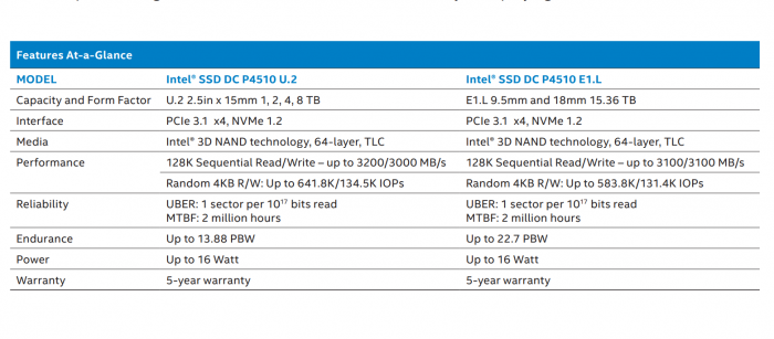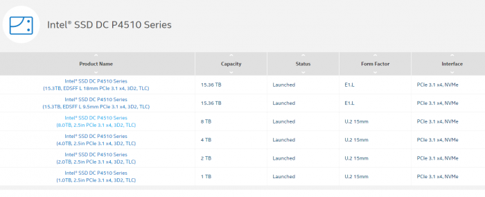 2018年2月份,Intel发布了全新的DC P4510系列企业级SSD,也是第一次采用自家64层堆叠3D TLC闪存,采用2.5英寸15毫米U.2接口,最大容量8TB。两年多过去了,DC P4510系列悄然升级,加入了全新的E1.L形态,容量翻番高达15.36TB。