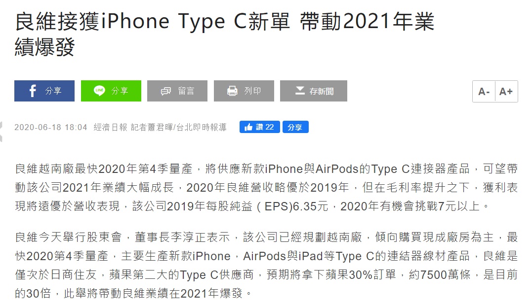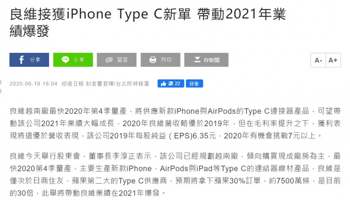 目前在苹果供应链条中,良维是仅次于日本住友的USB-C接口供货商。