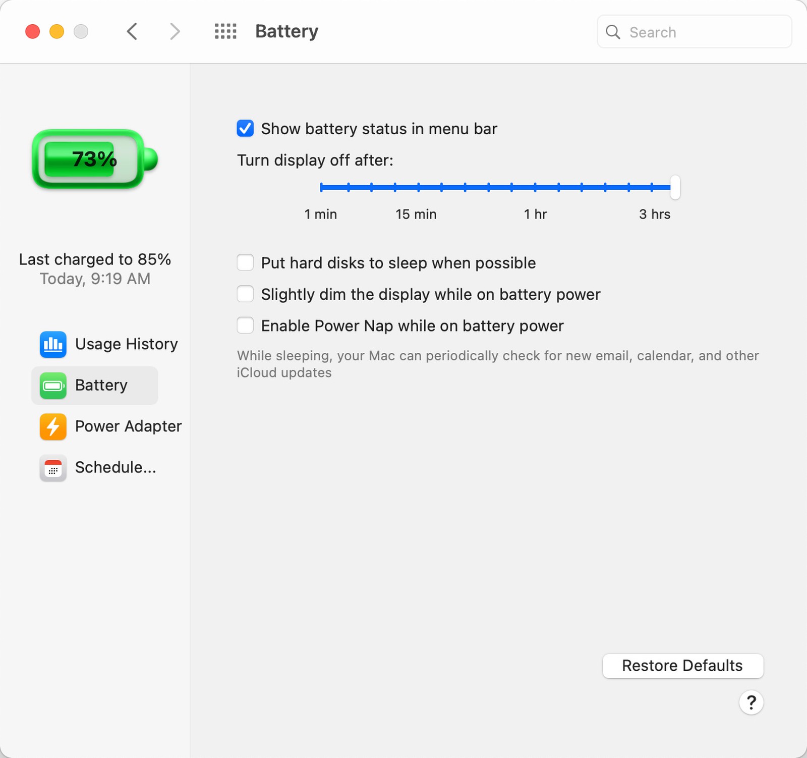 除“使用历史记录”部分外,还有“电池和电源适配器”部分,它们取代了之前通过“节能”板块提供的功能。您可以选择何时关闭显示器,启用或禁用电源休眠等功能,并根据电池使用情况和连接电源后的使用情况来拆分设置,日程安排功能也存在于此。