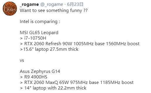 据悉,引发争议的是一份面向 Intel 合作伙伴(Partner Connect)的演示文稿,对比的是微型 GL65 和华硕 Zephyrus G14 两款游戏笔记本。