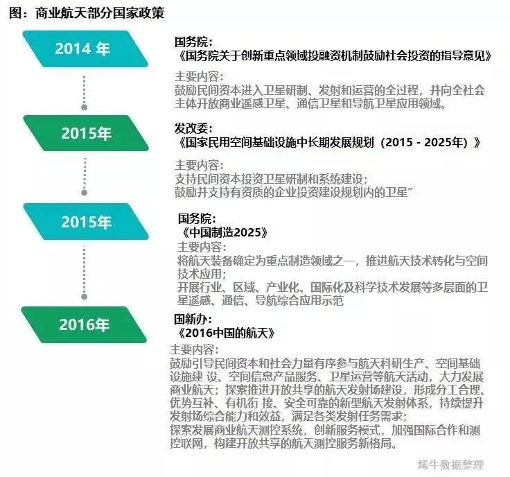 在国内,造火箭、发卫星一直以来都是 “国家队”的事情。直到 2012 年,政府主张 “军民融合”,陆续出台相关政策,让民营公司参与到火箭、卫星研制发射中。