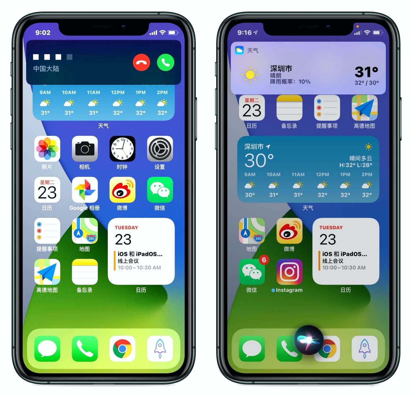 Siri 和来电提醒也采用了更为紧凑的设计,呼出 Siri 以及来电提醒不再占用整个屏幕,现在呼出 Siri 会在屏幕底部出现一枚“圆球”,得到的回复也仅显示在顶部;同样地,来电提醒现在只会在顶部以横幅的形式提醒,接听或者直接下拉横幅会出现更多通话功能。