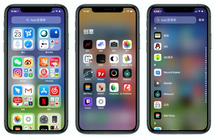 除了小组件,iOS 14 主屏幕的变化还包括加入了全新的“App 资源库”列表,这里会根据类型自动为你归类设备上的所有应用,而位于顶部的“建议”“最近添加”则分别是根据系统建议和最新安装到设备上的应用来划分的。