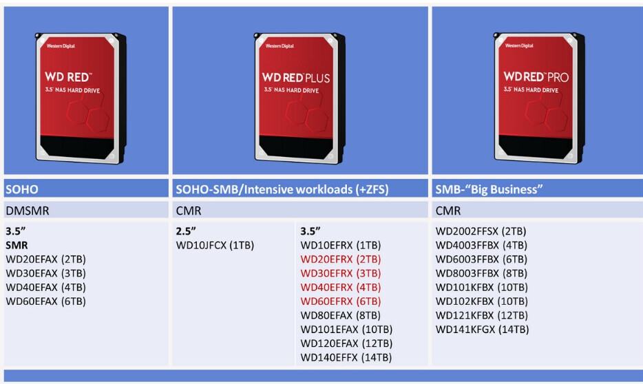 红盘Plus清一色采用CMR,等于是红盘和红盘Pro的中间品。红盘依旧是SMR,西数也在博客文章中苦口婆心地强调,对于非密集负载的SOHO用户来说,红盘依然适合,其性能也并不差,但在RAID重建中可能会多花费一些时间。