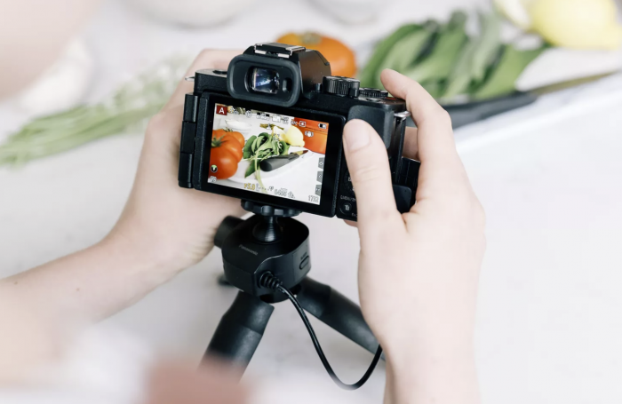 G100有一个电子取景器,松下说比Lumix G90的取景器亮度高2.8倍。索尼的ZV-1没有这个功能,但G100和ZV-1都有一个衔接显示屏。在新的Lumix中,当显示屏向外侧翻开时,会自动触发视频自拍录制模式,一旦找到用户的脸,就会立即调整景深。G100的视频功能会在屏幕上用红色勾勒出画面,让你知道它正在录制。如果你想上传到多个平台,如YouTube或Instagram,你可以在迅速切换录制的宽高比(由另一个颜色编码的边框表示),而无需后期处理。