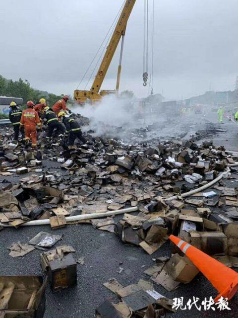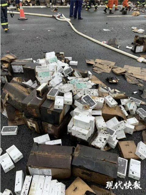 根据网友拍摄的照片,事故现场散落堆积了大量的货物,已经全部烧黑,从外壳包装来看,是大量的苹果手机,有黑色也有绿色,型号为iPhone 11或iPhone 11 max。另一段视频中,一位网友表示,烧毁的手机有2万台之多。