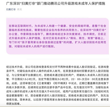 6月25日消息,日前,“扫黄打非”微信公众号发布消息表示,在深圳市“扫黄打非”办公室、市委网信办指导下,腾讯游戏正式升级未成年人保护措施,在对已实名未成年人“限玩、限充、宵禁”基础上,专门针对“孩子冒用家长身份信息绕过监管”的问题,扩大人脸识别技术应用范围,对疑似未成年人的用户进行甄别。