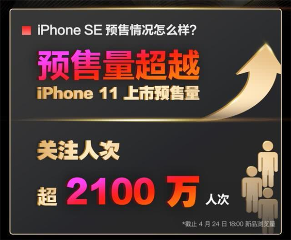 另一方面,新iPhone SE表现也抢眼,该机首销期间在拼多多等第三方平台跌破首发价。京东平台预售量超过了iPhone 11上市预售量,关注人次超过了2100万人次,人气火爆。