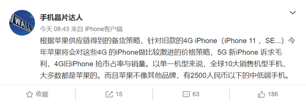 6月25日消息,@手机晶片达人表示,根据苹果供应链得到的备货策略,针对旧款的4G iPhone(iPhone 11、iPhone SE),今年苹果将会对这些4G iPhone做比较激进的价格策略,5G新iPhone诉求毛利,4G旧iPhone抢市占率与销量。