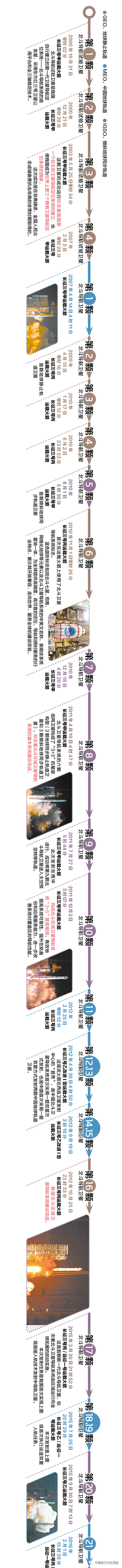 2000年10月31日,第1颗北斗试验导航卫星成功发射。2020年6月23日,北斗全球组网阶段的收官之星成功发射。6月24日凌晨1时53分,在西安卫星测控中心科技人员的精确测量和控制下,北斗三号最后一颗全球组网卫星完成了首次变轨,目前飞行状态平稳,各项指标参数正常。