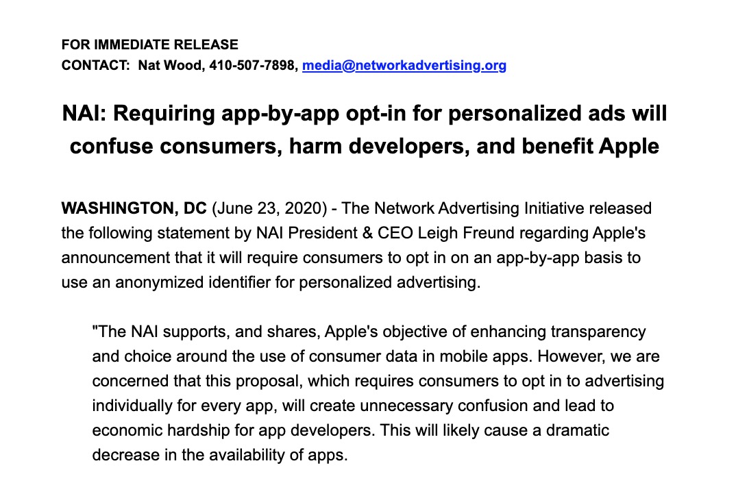 苹果一向将隐私作为其设备的关键卖点。该公司表示,它欢迎支持广告的应用程序,但用户应注意到自己是否会被跟踪。苹果表示,它还在扩展面向开发者的工具,使其能够在不了解用户身份的情况下精准投放广告。