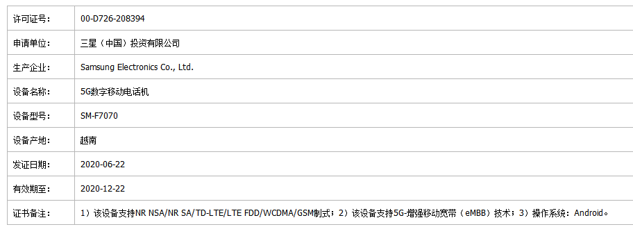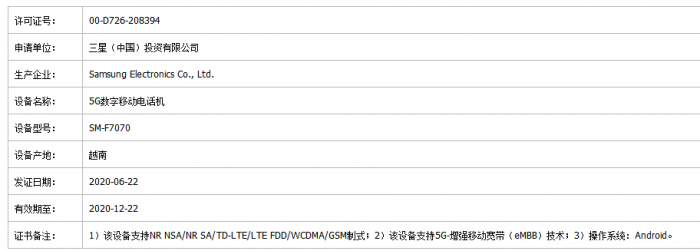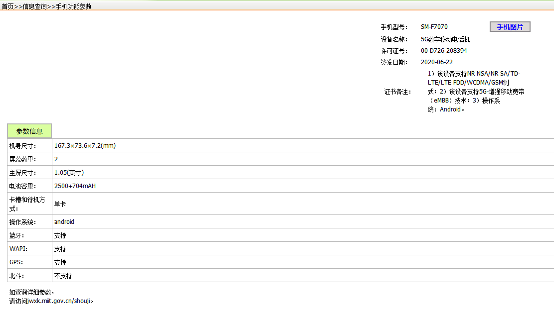 查询工信部网站,型号为“SM-F7070”的三星Galaxy Z Flip 5G通过认证 。根据认证信息显示,该机的机身尺寸为 167.3×73.6×7.2(mm),采用 2500+704mAh 双电池设计,支持NR NSA/NR SA/TD-LTE/LTE FDD/WCDMA/GSM制式。外屏幕尺寸为1.05英寸,用于显示天气、来电等通知。