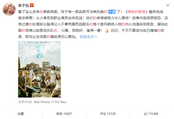 章子怡在个人微博发声:“看了这么多年的美剧英剧,终于有一部品质可与其抗衡的“中剧”了!《隐秘的角落》整体完成度非常高!从小演员到职业演员全体在线!他们的表演感受力令人震惊!故事内容细思极恐,没有过激的处理却分裂得让人不寒而栗而且配乐的每个音符都将人物的内心戏渲染到极致…据说此剧的导演以前是组乐队的…12集,刚刚好,值得一看!切记,千万不要成为自己情绪的奴隶,那会让生活里的痛变得无以复加。”