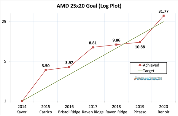 根据AMD给出的数据,以2014年初发布的Kaveri APU为基准,今年最新的Renoir APU的能效比已经是其31.77倍,远超当初设定的25倍目标!