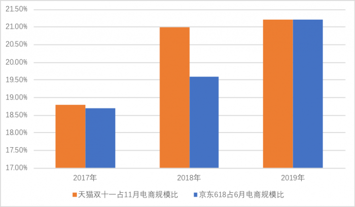 也就是说,从2017年开始,618才开启了“增量时代”,从对社消占比来看,距离老牌大促双十一仍有相当大的差距。