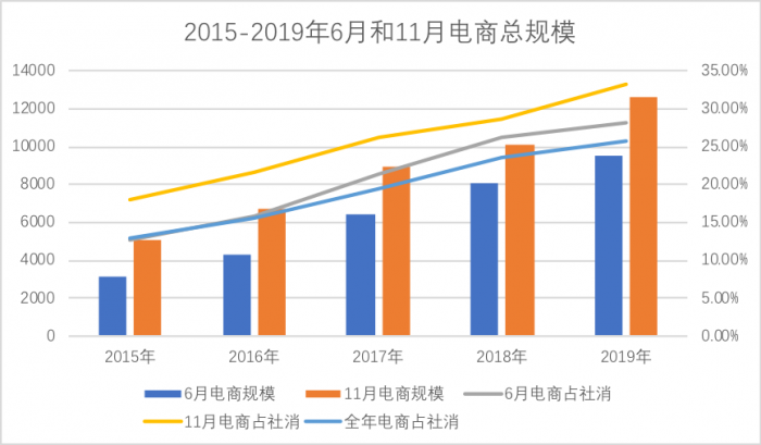 相较于经营超过10年,调动零售能力已经相当了得的双十一,618起步较晚,真正大热也就是近几年的事情,我们整理了2015年-2019年,6月和11月全国电商零售总规模,以及当期电商占社会消费品总额的比值情况,见下图: