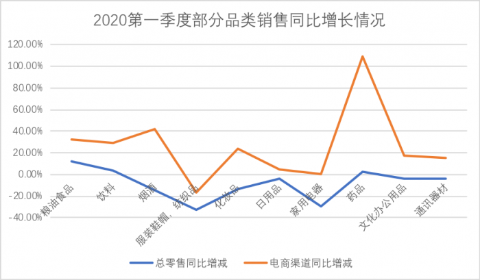 我们不妨从产业角度去思考,根据统计局和商务部数据,我们制作了部分重点品类在2020年第一季度中总零售和电商交易同比增长情况
